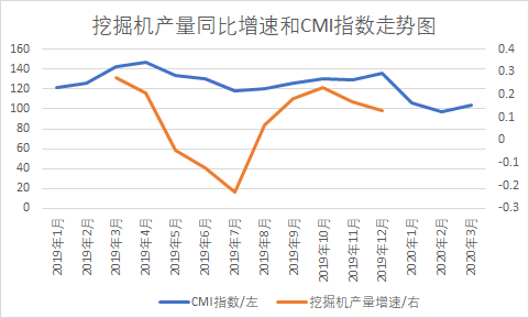Compared with the year-on-year growth rate of excavator output and CMI trend in each month, the year-on-year growth rate of excavator output and CMI index trend are basically consistent. In March 2020, the CMI index rebounded from the previous month, and the year-on-year growth rate of excavator production is also expected to increase in March 2020.